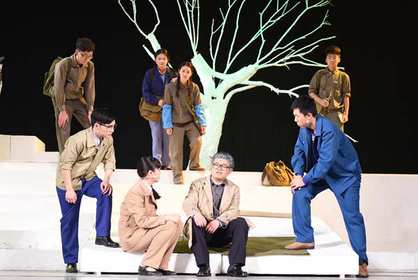 ? ? 場景中的小喇叭廣播再一次開始播報(bào)新聞,新聞的播報(bào)讓正拿著一堆科研手稿準(zhǔn)備給自己老師的雅坤瞬間撲倒在地。是的也讓我們的心跟著揪起來,就算我們已經(jīng)知道這位偉大的地質(zhì)力學(xué)之父、共和國第一位地質(zhì)部長、中國科學(xué)協(xié)會(huì)第一任主席、這面旗幟—李四光先生已經(jīng)離世,但是我們還是為這小喇叭播報(bào)李四光先生的隕逝而悲痛。雅坤逐漸在兄弟廣生的悲劇和老師去世的陰影中走了出來,踏著老師的足跡帶著兄弟的夢想依然在科研工作中奮戰(zhàn),繼續(xù)發(fā)展老師的研究成果。到此話劇《大地之光》已經(jīng)結(jié)束,可李四光先生精神魅力猶如他的名字一樣光照四方!