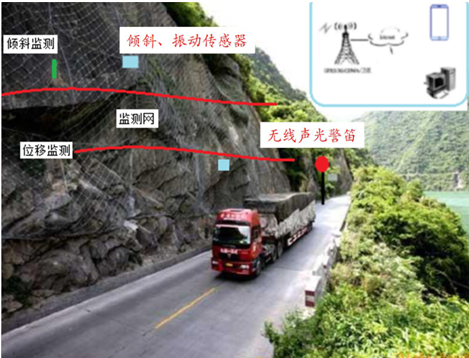解決方案:在崩塌體上加裝監視網,通過對檢測網多個部位作位移、傾斜、震動等高精度實時監測,達到對整個崩塌體實時監測預警的目的,在崩塌體下方公路上設置無線報警終端設備(包括無線信號接收器、聲光警笛、LED警示屏、太陽能供電系統),當智能檢測終端檢測到變形超過設定預警閾值時即時啟動報警程序,以避免人員傷亡和減小財產損失。