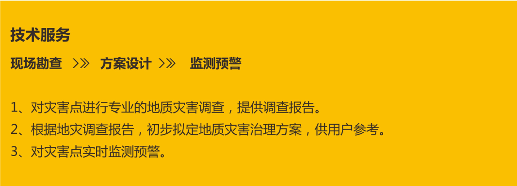 地災服務中心既有專利的支撐,又有技術和科研能力,根據用戶需求,對災害點進行專業的地質災害調查,根據調查報告,初步擬定地質災害治理方案,結合方案安裝設備,進行實時監測預警。同時對用戶提供現場培訓,及電話指導故障維修或者現場排除故障等一體化服務。